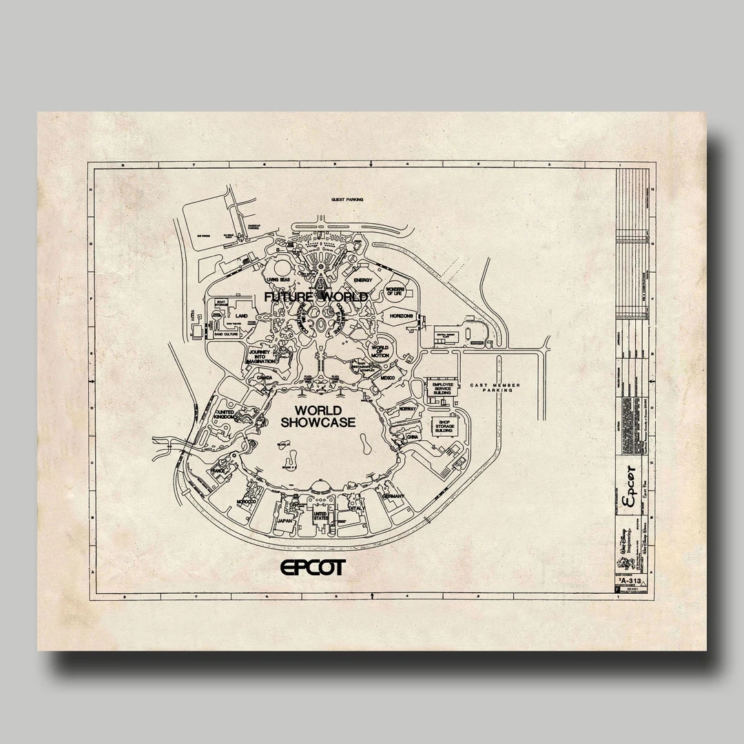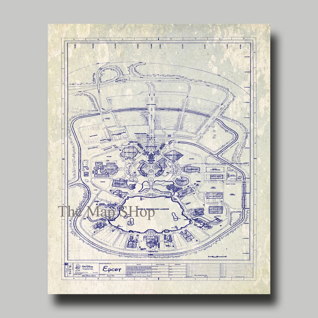 Disney World Epcot Blueprint Map Vintage Grunge Black Ink Print Poster Etsy