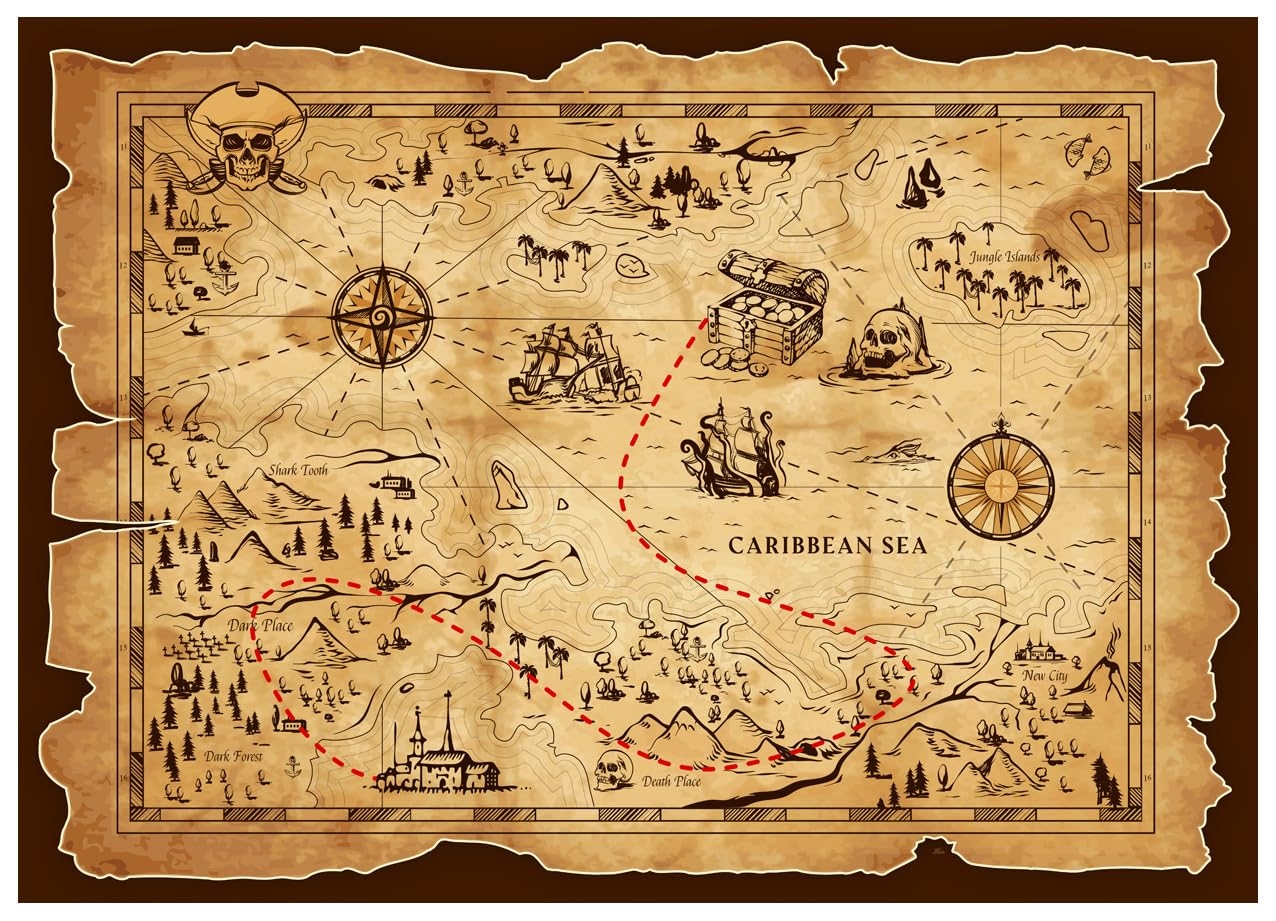 This beautifully illustrated map will guide you through uncharted waters, leading you to buried chests overflowing with gold doubloons and precious jewels. Get your pirate crew together and start your treasure hunt today!