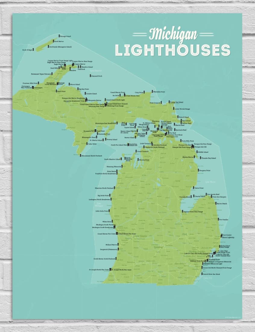 Amazon Best Maps Ever Michigan Lighthouses Checklist 18×24 Poster Green Aqua Office Products