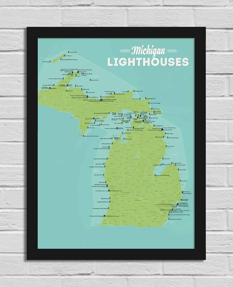 Amazon Best Maps Ever Michigan Lighthouses Checklist 18×24 Poster Green Aqua Black Frame Office Products