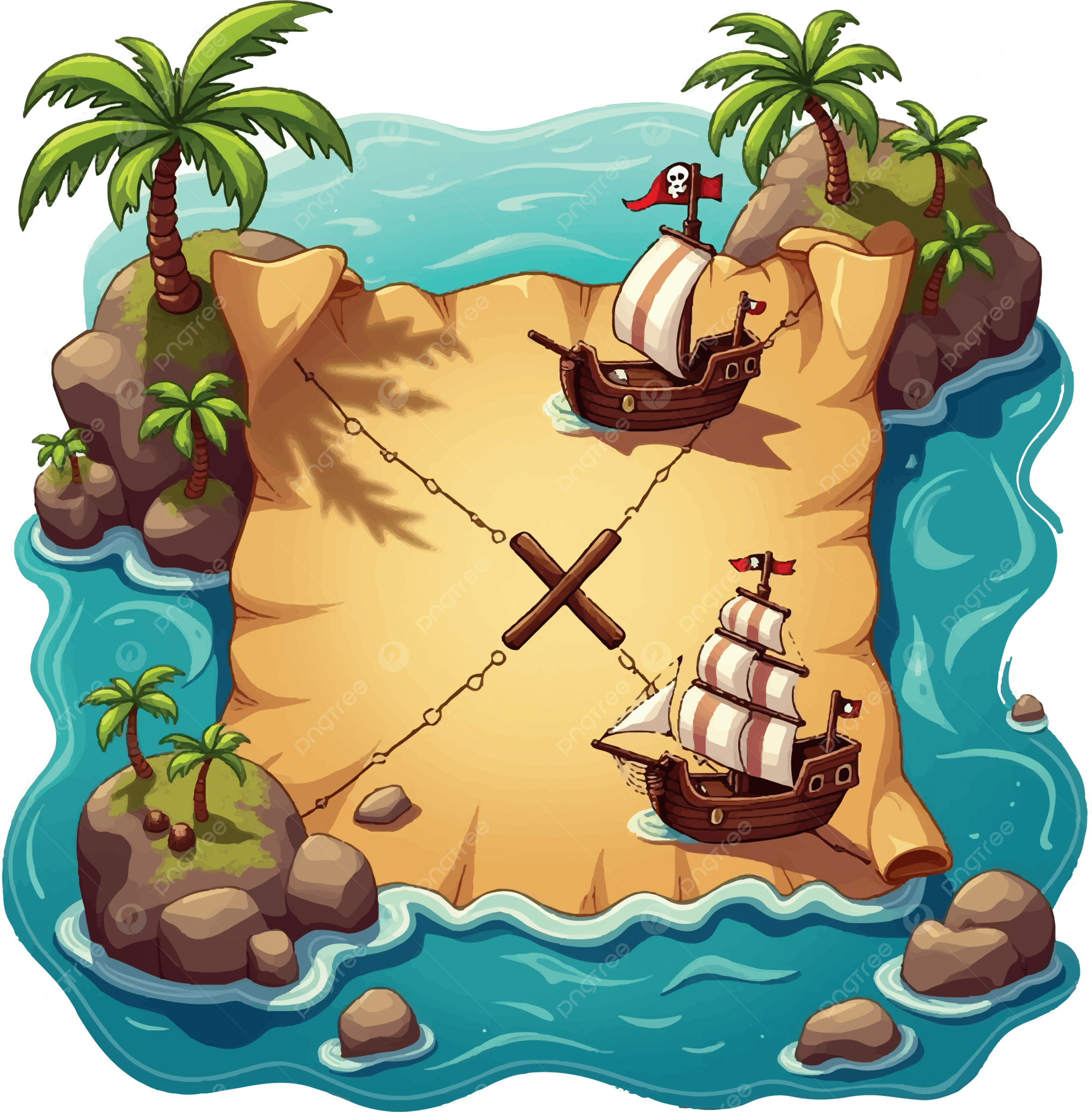 Pirate Treasure Map Illustration Cartoon Style With Ships Palm Trees And X Marks The Spot Map Clipart Pirate Clipart Treasure Clipart PNG Transparent Image And Clipart For Free Download