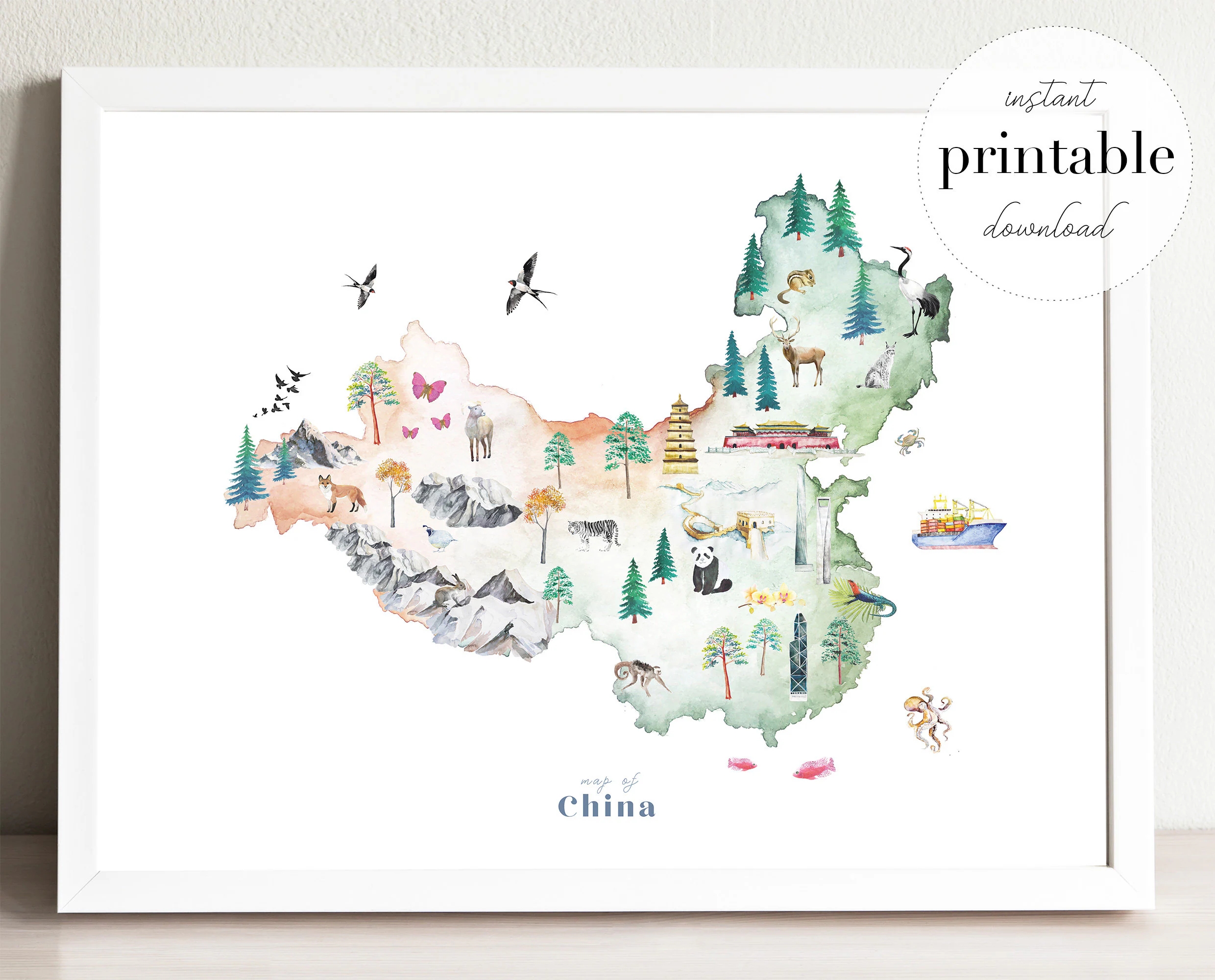 China Illustrated Map Printable Wall Art Print Nursery Decor Landmarks Kids Room Travel Print Drawing Animal Map Country Map Etsy