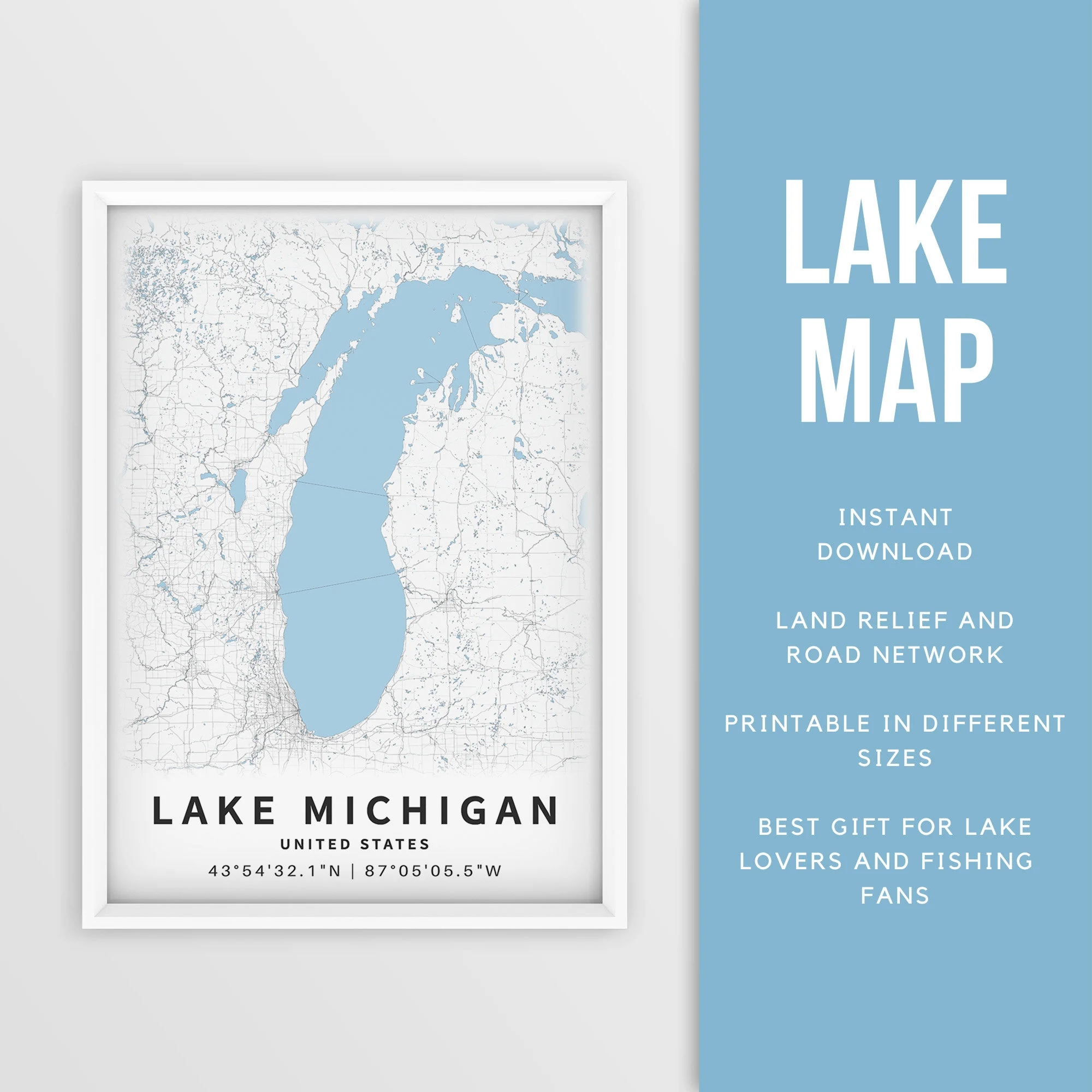 Printable Map Of Lake Michigan US Instant Download Lake Map Wall Art Map Poster Lake House Decor Lakelife Fishing Boating Etsy