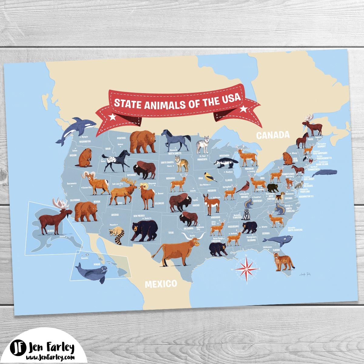 State Animals Of The USA Map Print Blue Version Jennifer Farley Picture Books Illustration Maps Design