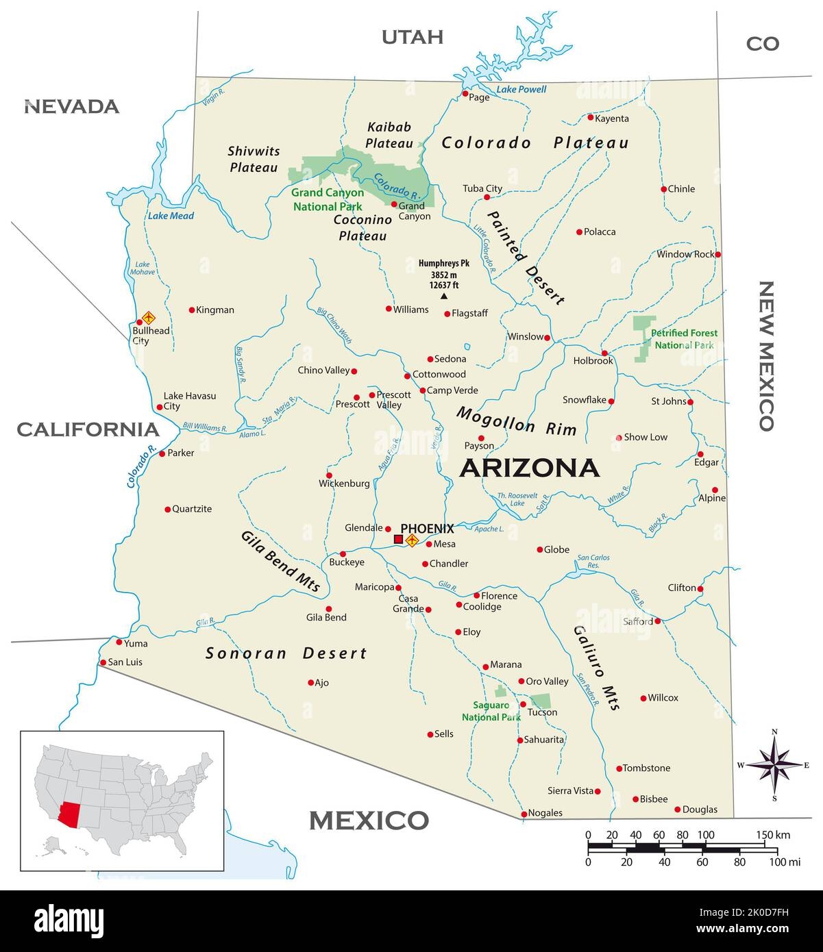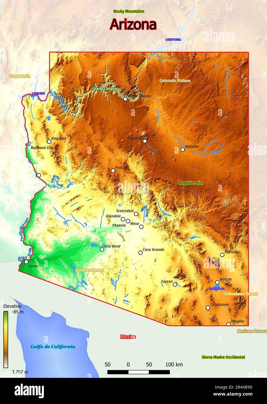The Physical Map Of Arizona Showcases A Stunning Desert Landscape Marked By Vast Expanses Of Arid Plains Deep Canyons And Towering Mountain Ranges Stock Photo Alamy