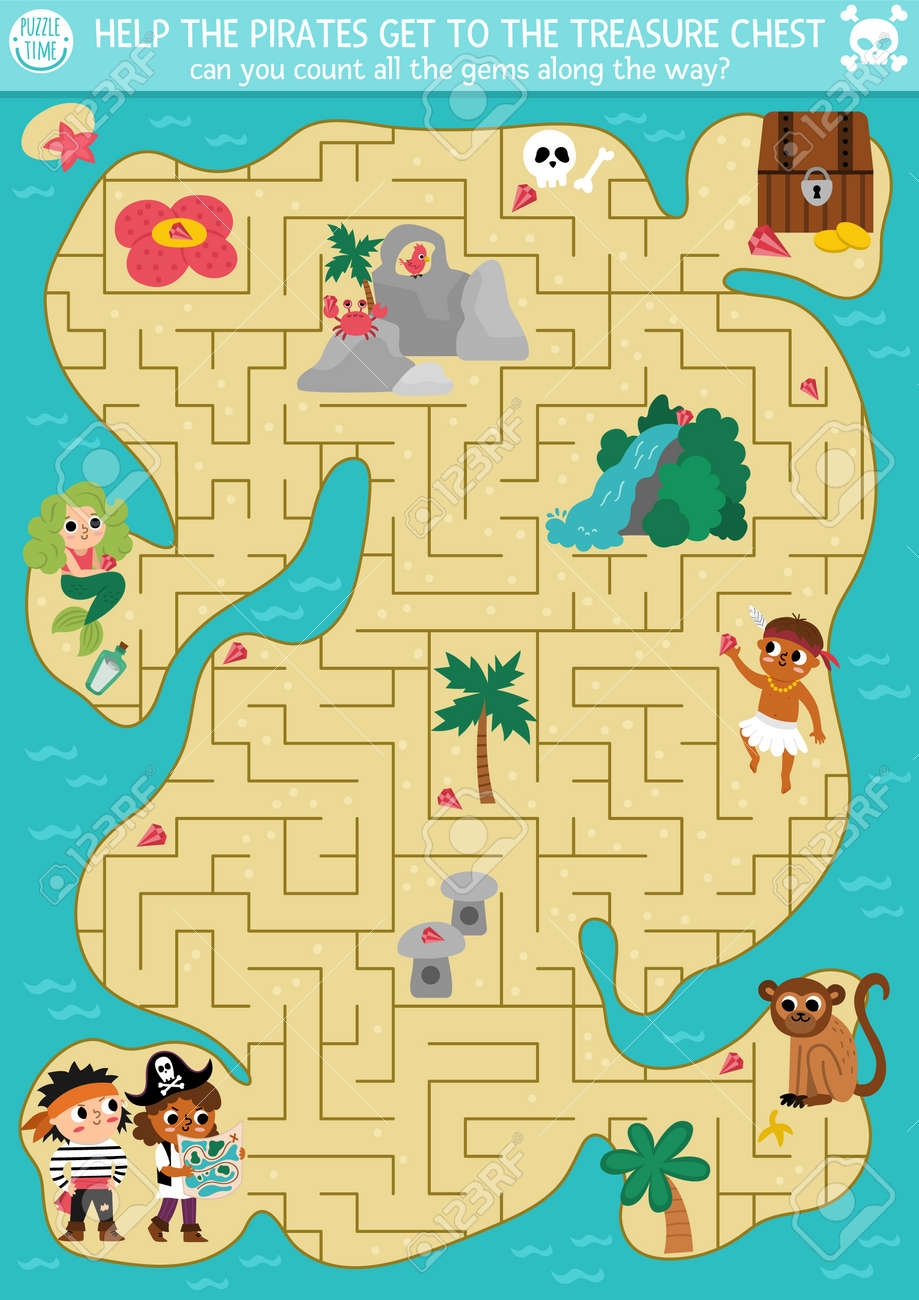 Pirate Maze For Kids With Tropical Treasure Island And Cute Kid Pirates Treasure Hunt Preschool Printable Activity Sea Adventures Labyrinth Game Or Puzzle With Chest Map Mermaid Royalty Free SVG Cliparts Vectors